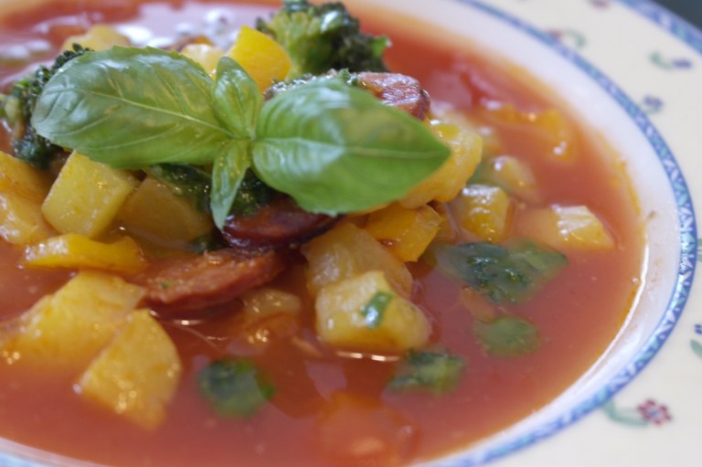 4. Zum Anrichten zuerst von der Tomatensuppe in einen tiefen Teller geben, dann Kartoffeln, Chorizo und Gemüse in der Mitte anrichten. Zum Schluss das Basilikum- Olivenöl darauf träufeln.
