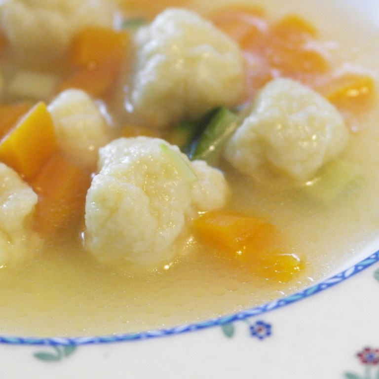 den Teig für die Butterklößchen herstellen, kleine Klößchen mit leicht geölten Händen formen und in die Suppe geben, leicht köcheln lassen bis alle aufgetaucht sind.