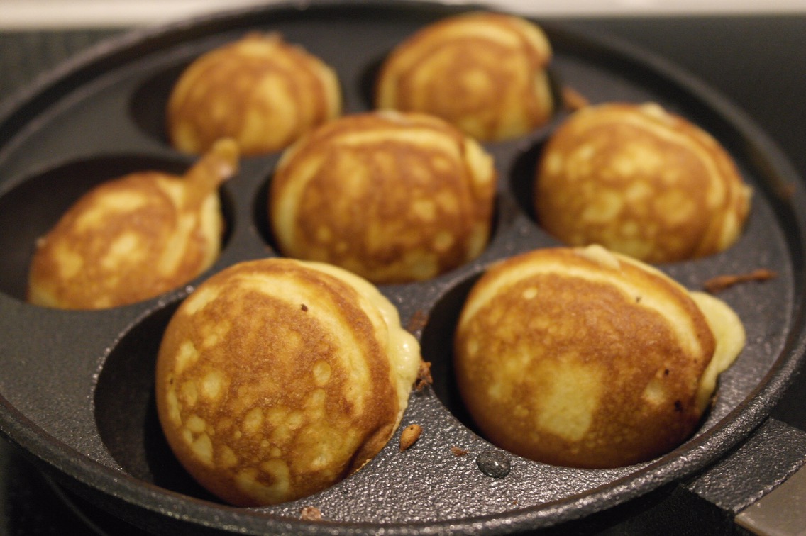 4. Die einzelnen Vertiefungen etwas ölen und die Poffertjes portionsweise ausbacken.