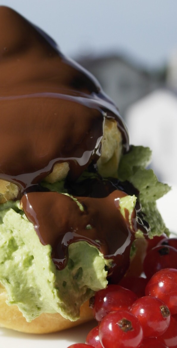 9. Fill the cream puff with the Matcha cream and put the chocolate on top.