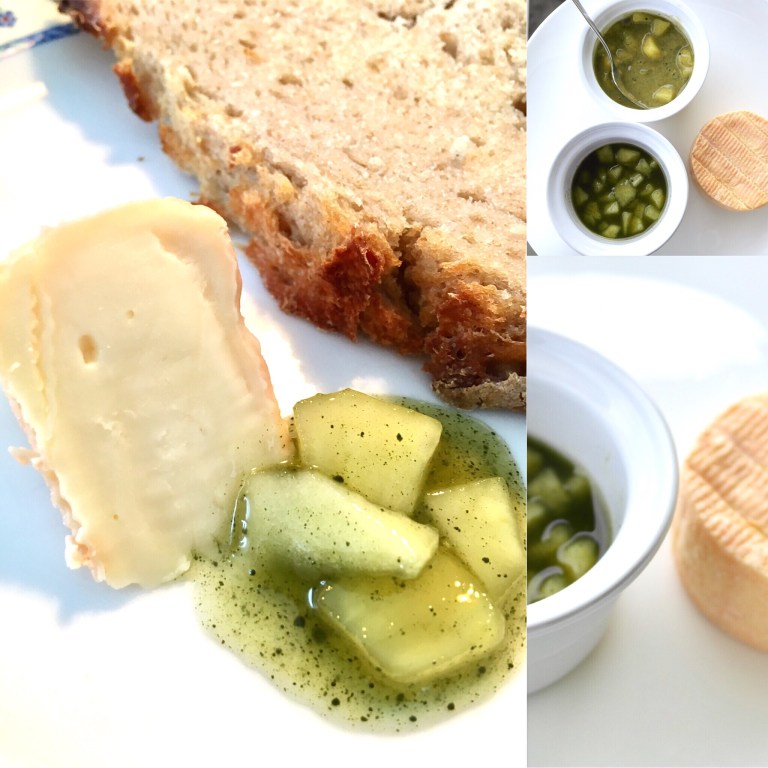 1. Peel the apple, cut it in little cubes. Put it with 3 Tablespoons of water, sugar and citron juice in a pot. Bring it to a boil for ca. 2min.