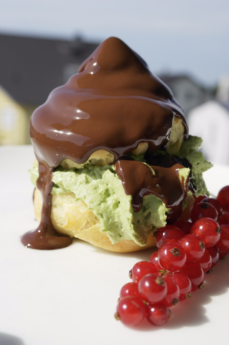 Windbeutel mit Matcha-Sahne und warmer Schokolade