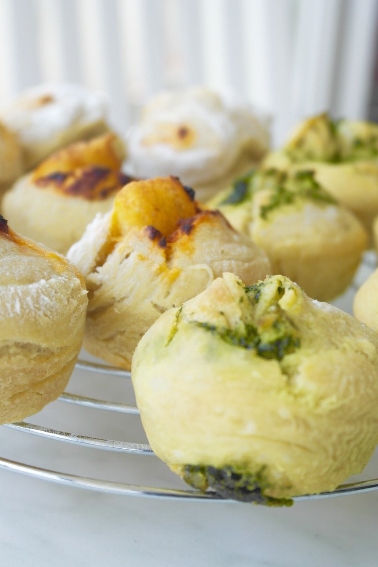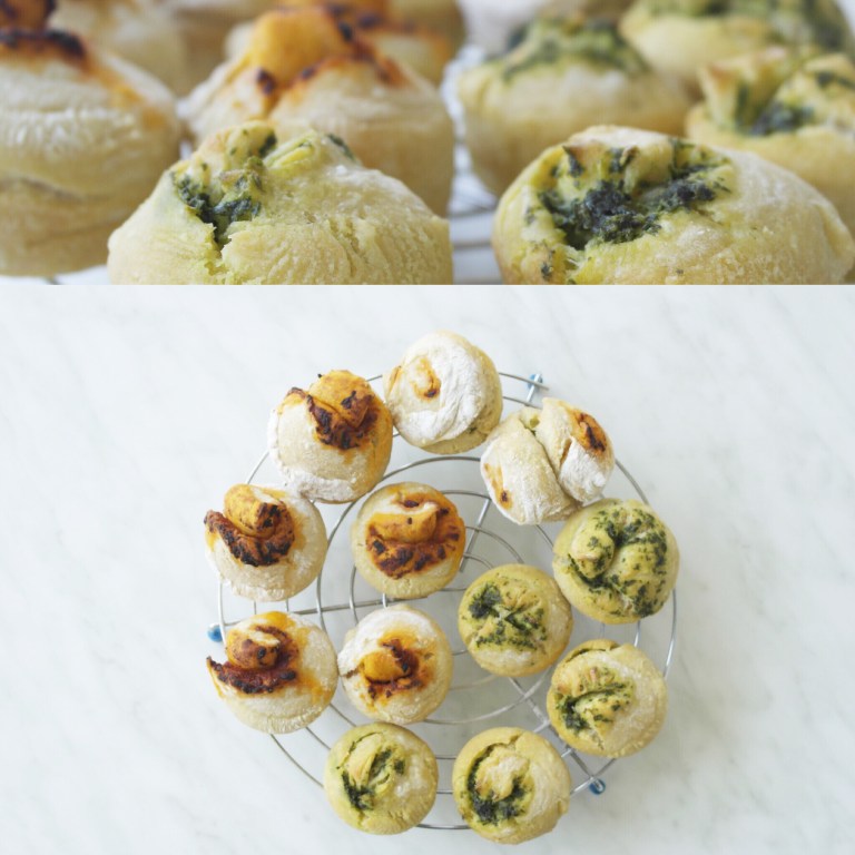 - Eine der zwei Füllungen darauf verteilen und den Teig von der längeren Seite her aufrollen, mit einem scharfen Messer in circa 5cm dicke Scheiben schneiden und mit der Schnittkante nach oben in die gefetteten Muffinförmchen setzen. Nicht wundern, der Teig ist recht weich, am besten man benutzt eine Teigkarte.