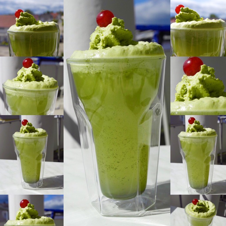- Eiswürfel in den Matchatee geben und Matchsahne daraufsprühen, nach Belieben mit Früchten garnieren.