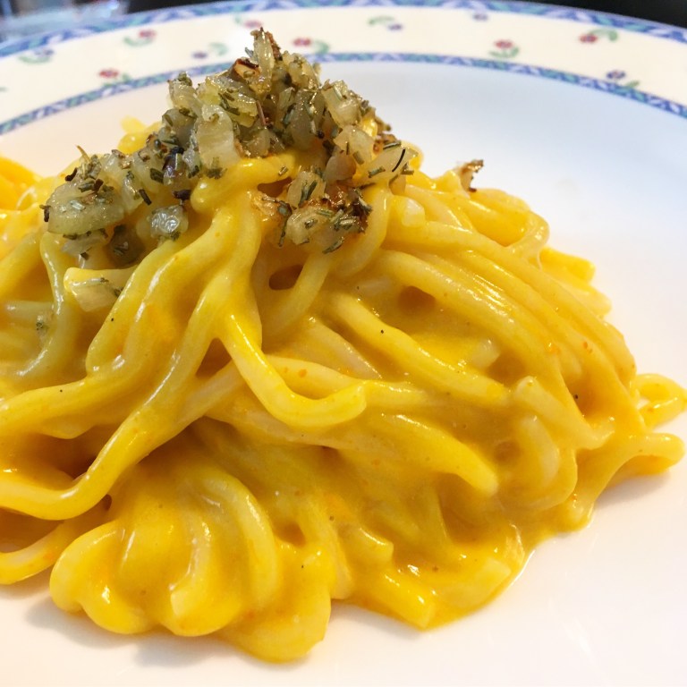 - Spaghetti mit der Kürbissoße mischen und mit den gerösteten Zwiebeln garnieren.