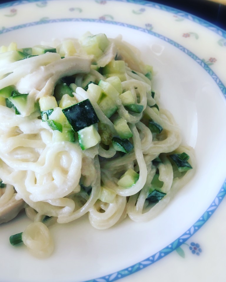 - Hühnerfleisch in ca. 2EL Olivenöl leicht anbraten, Zucchini klein würfeln und kurz mit braten.