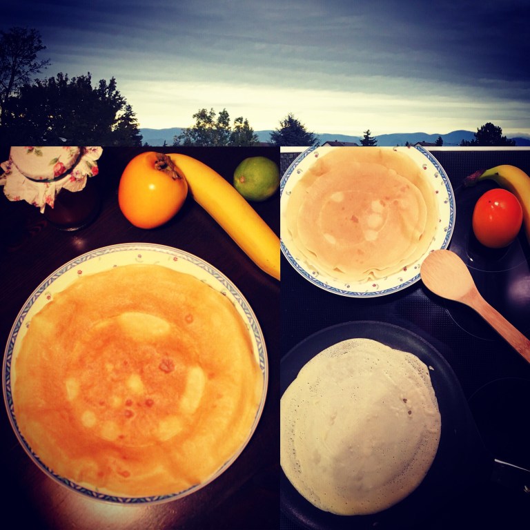 - Pfanne eventuell mit etwas Öl ausreiben, kleine Portion Teig in die Pfanne geben und mit einem Crêpesteigverteiler dünn ausstreichen. Auf beiden Seiten leicht bräunen, fertig!