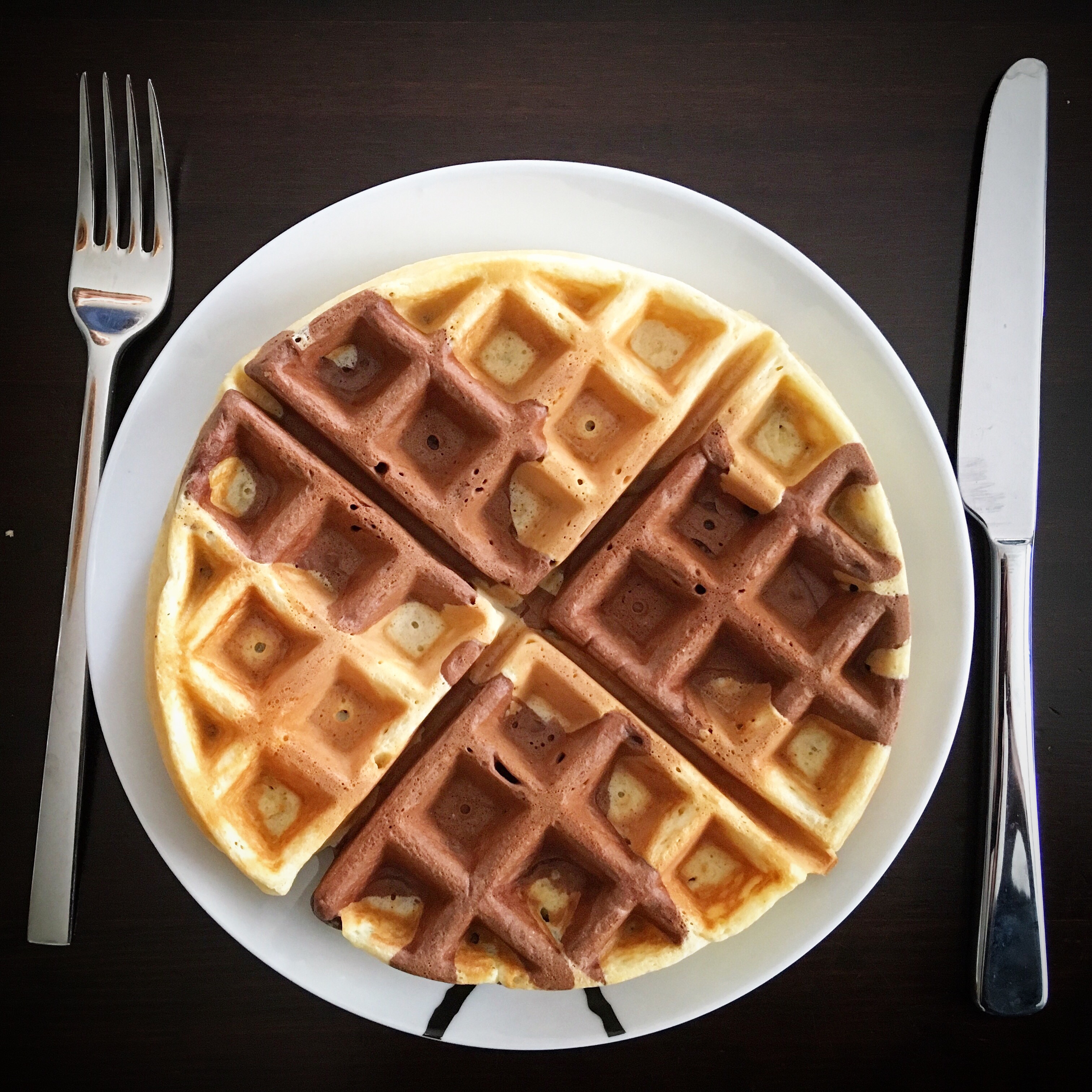 - Waffeleisen erhitzen. Dann erst ein paar Kleckse Schokoteig darauf verteilen und obendrauf vom hellen Teig, nun Waffeleisen schließen und goldbraun backen.