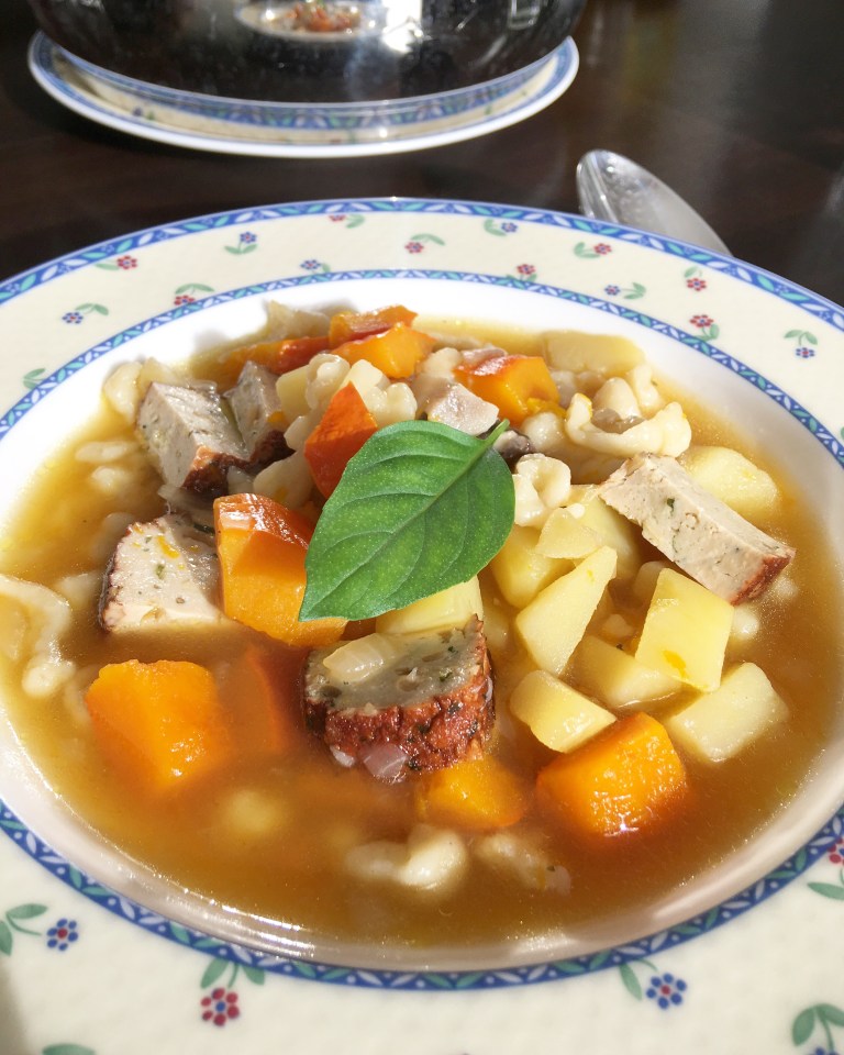 - Eintopf ca. 30min. köcheln lassen, dann den Spätzleteig über ein Spätzleblech direkt in den Eintopf streichen, nochmal kurz aufkochen.