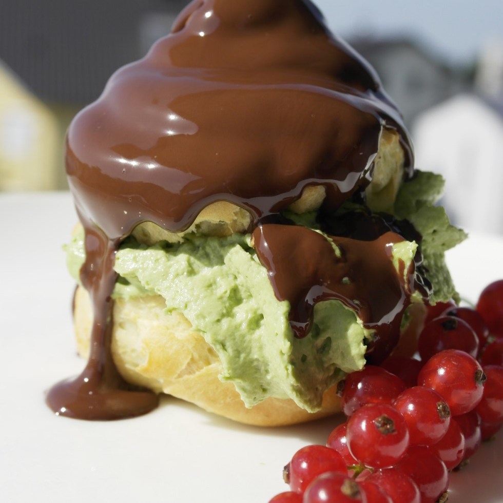 Windbeutel mit Matcha-Sahne und warmer Schokolade