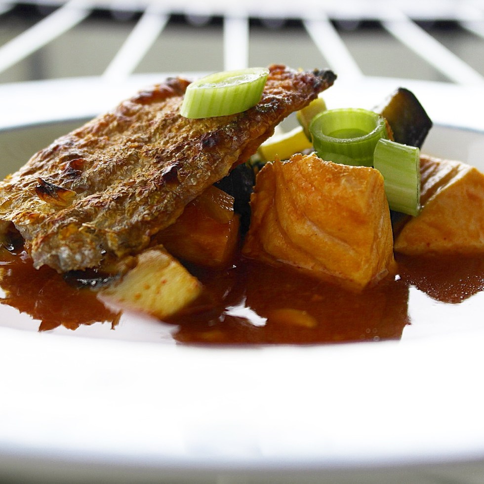 Orientalischer Lachseintopf mit Aubergine und knuspriger Lachshaut