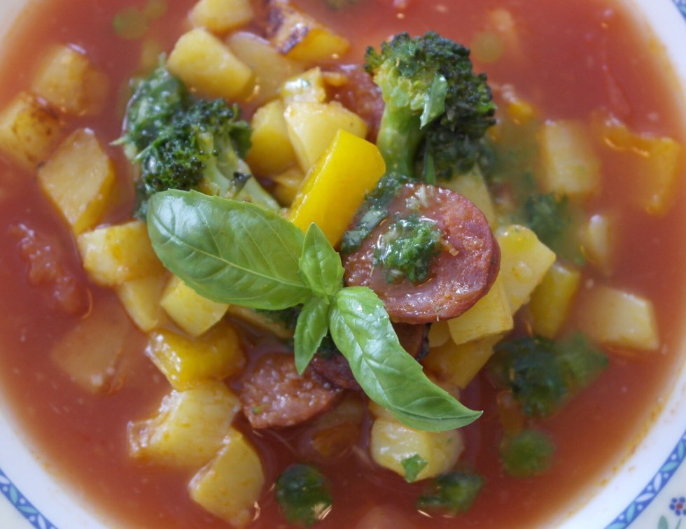 Tomatensuppe mit gebratener Chorizo und Kartoffeln